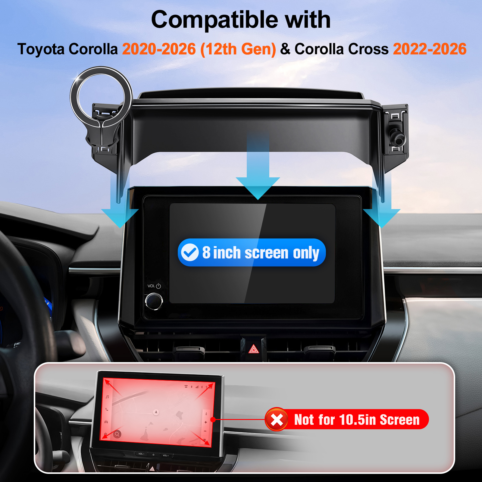 Designed exclusively for 2020-2025 12th Gen Toyota Corolla Sedans and 2022-2025 Corolla Cross suv models with 8-inch touchscreens. (Please confirm your screen size before purchasing—reach out with a photo if unsure to ensure a seamless, non-intrusive fit. )