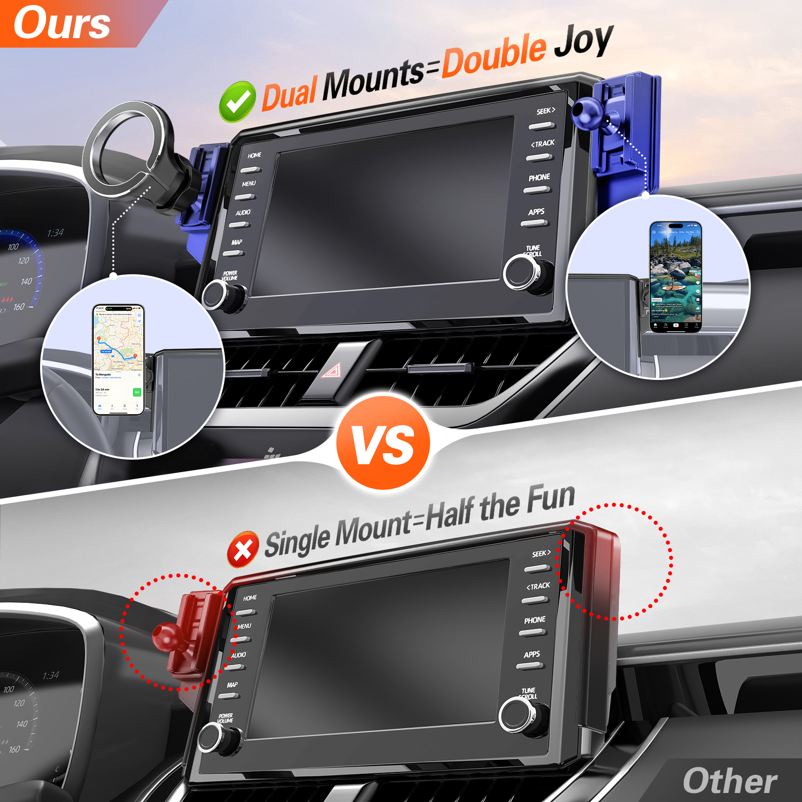 Newly Upgraded Design: Unlike single-sided fixed car mount, ours has a dual-head design for flexible left/right installation (includes 1 magnetic mount + 2 ball heads, works with your own mount). Left side fits driver’s view—safe navigation/calls with eyes on road; right lets front passengers(family/friend) easily watch video, movie or take selfies with hands-free. One navigates, the other enjoys—no interference. Ideal for daily commutes/family trips, making every journey efficient and pleasant