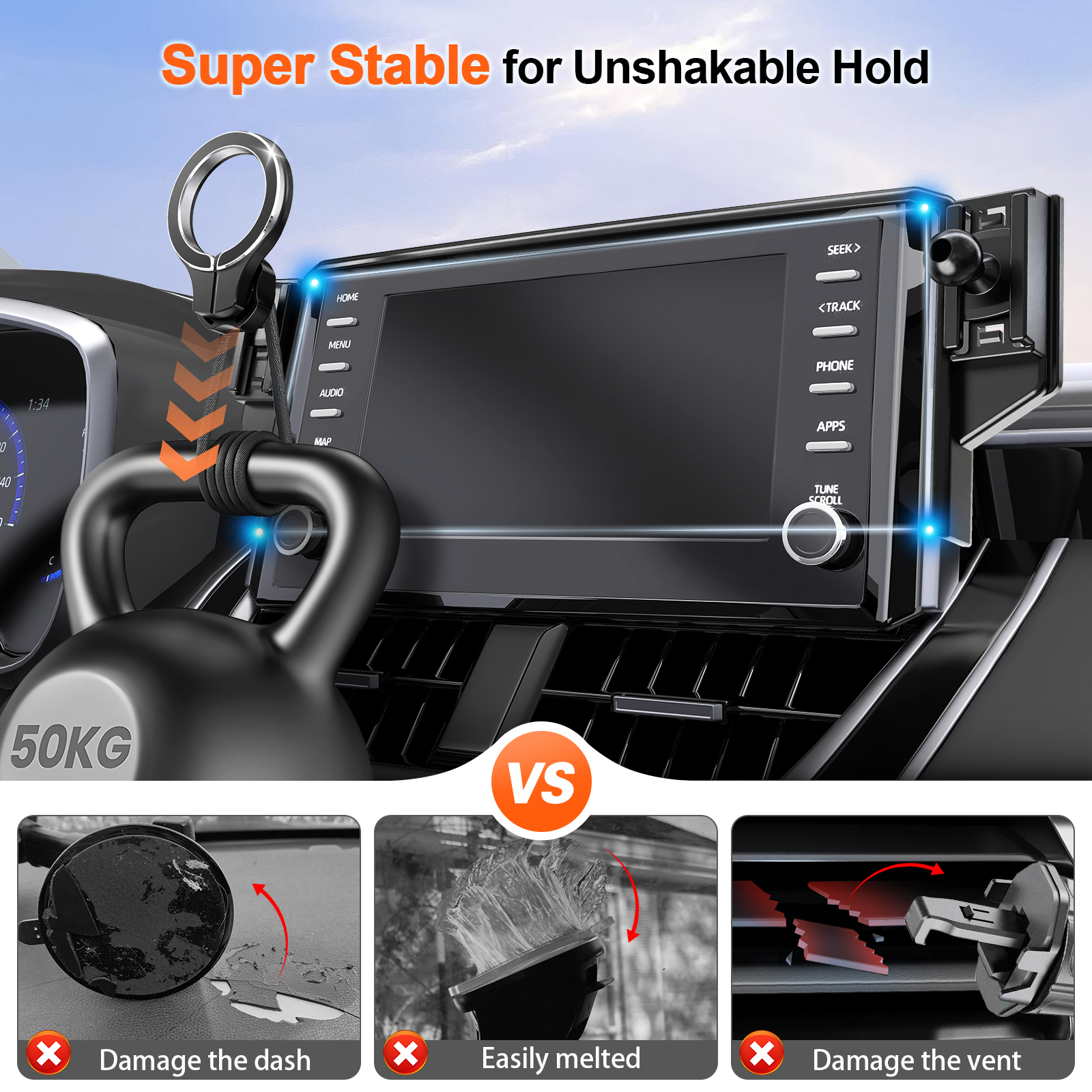 No drilling, no dashboard stickers. Simply slide the mount onto your infotainment screen—its slim design blends with your Corolla’s curves, nearly invisible at a glance, like it’s always been there. Includes 3M adhesive for optional extra stability, with easy repositioning—no “permanent commitment” stress.