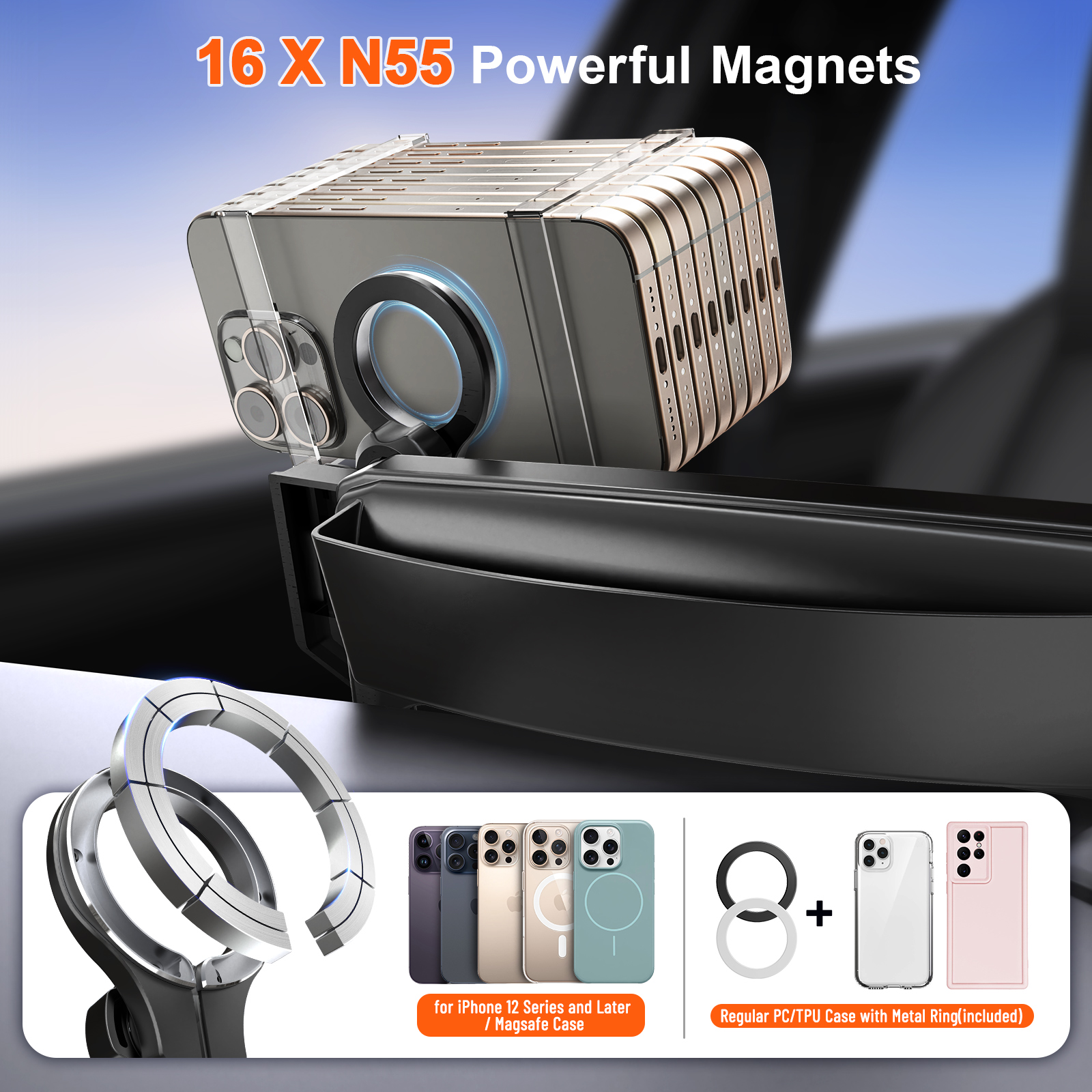 16 built-in N55 magnets deliver unbeatable hold—your phone stays locked in place through bumps and sudden stops, yet releases with a gentle tug.