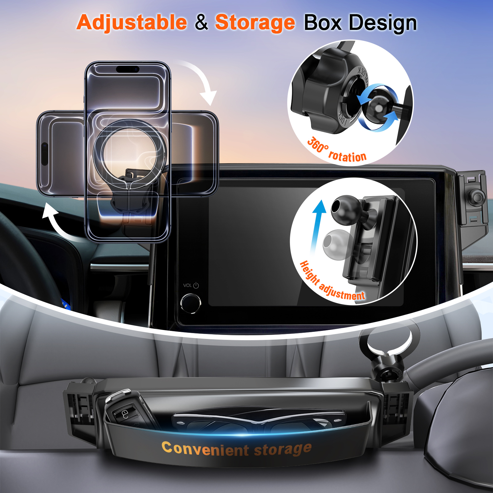 Adjust As You Like: This cell phone holder for Toyota has a 360° rotating ball joint, allowing easy one-handed adjustment of phone to portrait, landscape, or any angle, ensuring clear GPS visibility. It includes a height-adjustable base that locks into your preferred position with a simple upward push, enabling hands-free operation throughout for safer driving. Plus, a bonus storage slot behind the screen holdes small items like keys, sunglasses, and tissues, maximizing your car’s interior space